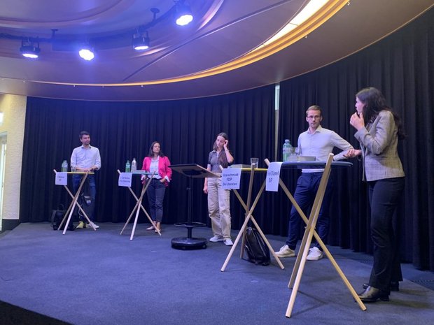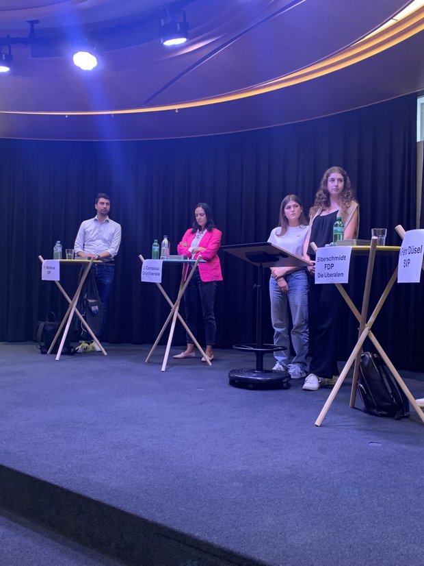 Am besagten 4. Oktober konnte die Kanti Zimmerberg vier Nationalratskandidierende begrüssen. Fabian Molina (SP), Julie Cantalou (Grünliberale), Andri Silberschmidt (FDP/Die Liberalen) und Nina Fehr Düsel (SVP) lieferten sich in der Aula unter der wechselnden Leitung der acht Schülerinnen und Schüler zuweilen hitzige Debatten zu den Themen Neutralität, Migration, Renten- und Gesundheitskosten sowie Klimafragen. Gebannt folgten die Schülerinnen und Schüler der 5. und 6. Klassen den vier debattierenden Politikerinnen und Politikern, die sich spürbar animiert den spitzfindigen und ausgeklügelten Fragen des Moderationsteams stellten. Als die Debatte zuweilen zu eskalieren drohte, lenkten die rhetorisch qualifizierten Moderatorinnen und Moderatoren das Gespräch wieder in die gewünschte Richtung.