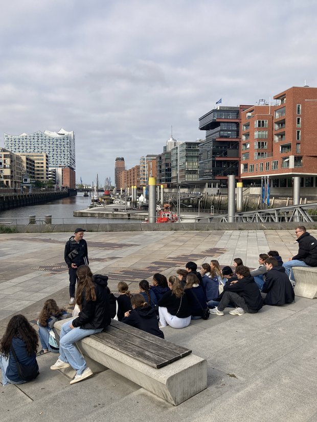 Nach der Nacht im Nachtzug kommen wir morgens ca. um acht Uhr in Hamburg an. Wir laden zuerst unser Gepäck im Hostel ab und gehen dann zum Hafen, wo wir eine Hafenrundfahrt geboten bekommen. Wir erfahren Spannendes über die Speicherstadt, einige Containerschiffe, die im Hamburger Hafen verkehren, und andere sehenswerte Gebäude rund um den Hafen. Am Nachmittag geht es viele Treppen hinauf: auf den Kirchturm von der Michaeliskirche, wo wir einen schönen Ausblick über Hamburg geniessen. Bevor wir am Abend in den Stand-up Comedy Club gehen, nutzen wir die Freizeit, um Hamburg besser kennen zu lernen.