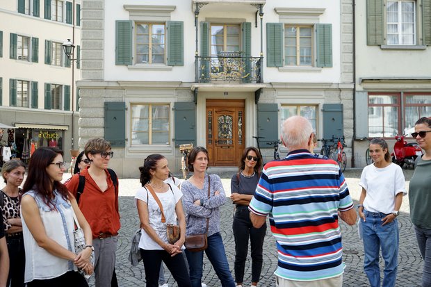 Unser Stadtrundgang führt uns für längere Zeit in den Bunker aus dem zweiten Weltkrieg, wo jetzt die Studentenverbindung Rudolfia ihren Stammsitz hat. Bei Stromausfall lässt sich deren Zapfhahn mit einem Generator per Tandem betreiben. Vor allem aber hören wir einiges über Verteidigungsstrategien in der Region des Linthkanals im Zweiten Weltkrieg, über die Akte Tannenbaum und deutsche wie später auch russische Spionage. Draussen auf der Gasse schnuppern wir wieder Rappenswiler Rosenduft und hören die mittelalterliche Legende über die Anfänge der Stadt: über Graf Rudolf von Rapperswils Baufreudigkeit und das grosse Vertrauen, das seine Frau Mechthild bei Hirschkühen genoss. Mechthild soll auch dafür verantwortlich gewesen sein, dass die Stadt vom linken auf das rechte Seeufer verlegt wurde. Wie das Resultat bestechend zeigt: Rudolf tat gut daran, auf Mechthild zu hören!
