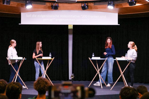 «Soll die eidgenössische Volksinitiative ‘200 Franken sind genug!’ angenommen werden? Die Debatte ist eröffnet.» Auf der Pro-Seite führte Selina Dörig, 4c, rechtliche Bedenken ins Feld: In der heutigen Zeit produziere die SRG eine beträchtliche Menge an Kulturinhalten, obwohl die Notwendigkeit nicht hier wäre. Nur wenige Menschen schauten sich diese Inhalte an, und daher argumentierte auch Lena Beck, 4a, dass das dafür aufgewendete Geld verschwendet sei. Doch die Kontra-Seite, vertreten durch Emilia Schimert, 4b, und Nina Anderegg, 4d, konterte mit konkreten Zahlen und harten Fakten: Die SRG sei dazu verpflichtet, auch kulturelle Inhalte zu veröffentlichen, so das Gesetz.