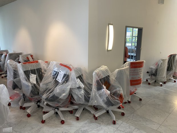 Ein grosser Teil der neuen Möbel für die Büros der Vewaltung, für die Mediothek und die Vorbereitungszimmer der Lehrerschaft wurden geliefert. Täglich nehmen so die Räume der neuen Schule Gestalt an und werden mit Inhalten gefüllt.