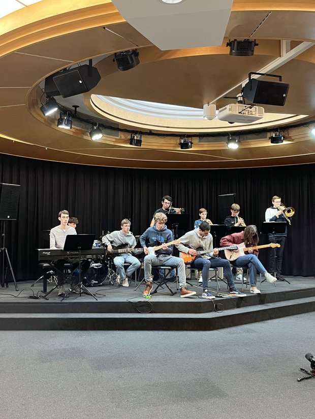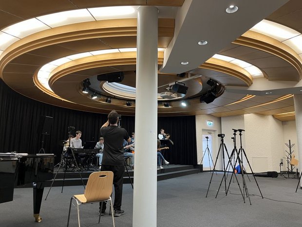 Die Abendsonne strahlt durch die Fenster und bei uns allen breitet sich das vorfreudige Gefühl auf einen ganz speziellen Freitagnachmittag aus. Der Videodreh startet am Mittag mit aufgeregtem Einspielen, gefolgt vom Einrichten unserer Instrumente in der Aula. Nach einer kurzen Pause führt uns der Kameramann durch den Ablauf. Unsere Mission: Unsere Lieder mehrmals spielen, bis der beste Take eingefangen ist. Die Kameras, strategisch gut platziert, nehmen uns aus verschiedenen Blickwinkeln auf. Die Atmosphäre ist durchdrungen von Freude und Anspannung, während wir als Gemeinschaft auftreten, uns gegenseitig anspornen und gemeinsam lachen.