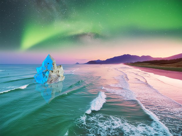 Bildwelten (von Vivienne Brunner, Clea Camastral, Victor Heer und Vivien Kaufmann, Klassen 3a und 3b), entstanden in einem kreativen Prozess, der in mehreren Stufen von der handgefertigten Skulptur über ausgefeilte «Prompts» zum digitalen Bild führte (interdisziplinäres Projekt Bildnerisches Gestalten & Deutsch «Insellandschaften mit Photoshop und KI gestalten»).