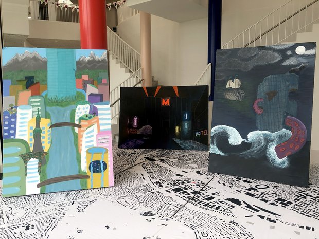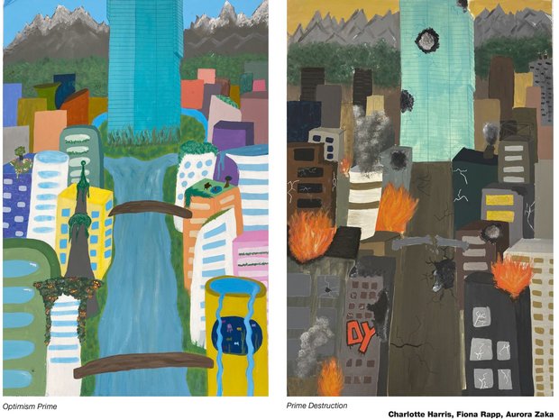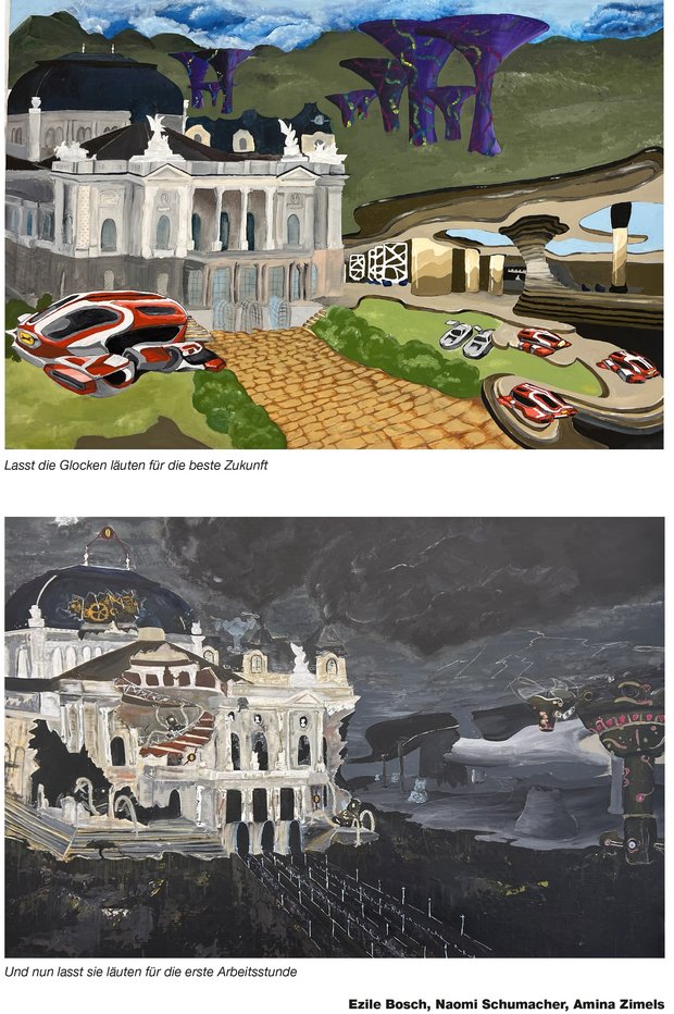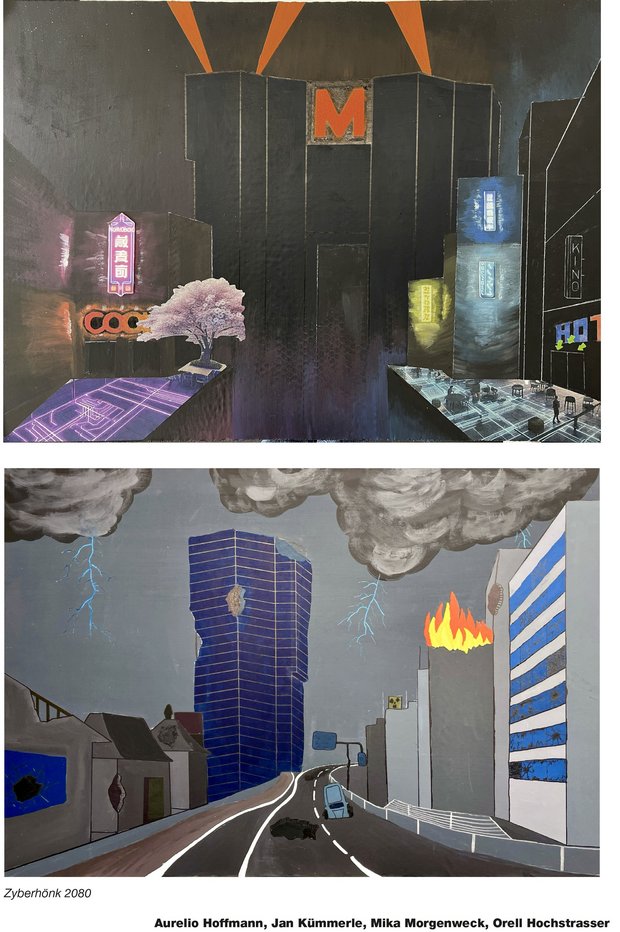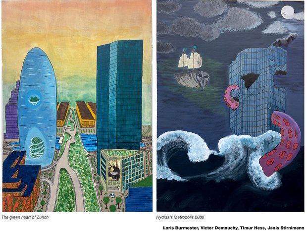 Die Schülerinnen und Schüler setzten sich in Gruppen mit einem spezifischen Ort auseinander und entwickelten sowohl utopische als auch dystopische Visionen, wie sich dieser Ort in Zukunft verändern könnte. Mittels Zeichnung und Malerei, Collage-Technik und digitaler Bildmontage übersetzten sie ihre Ideen und Vorstellungen in grossformatige neue Stadt-Bilder, die am Ende in einer Ausstellung vor der Aula präsentiert wurden.