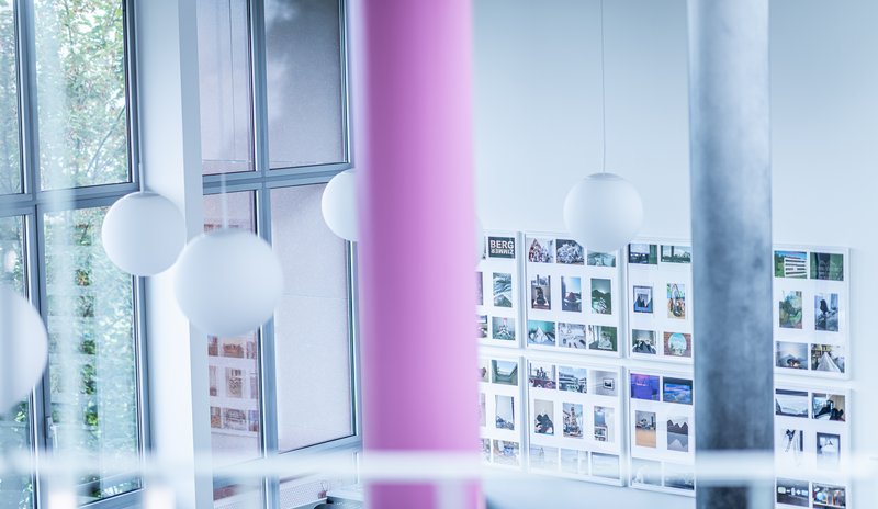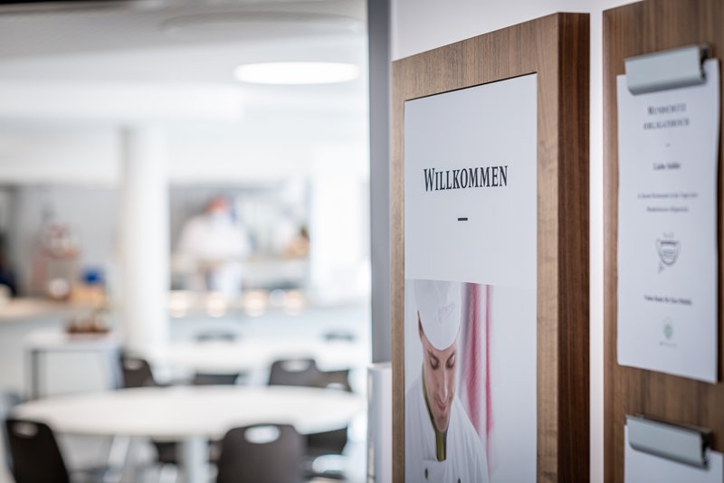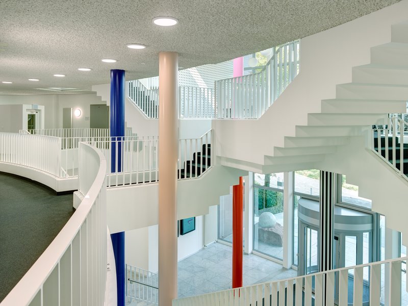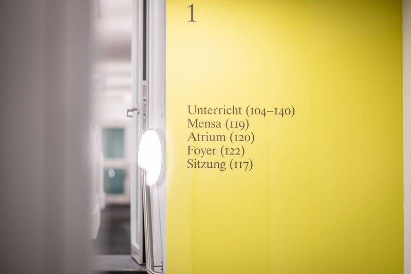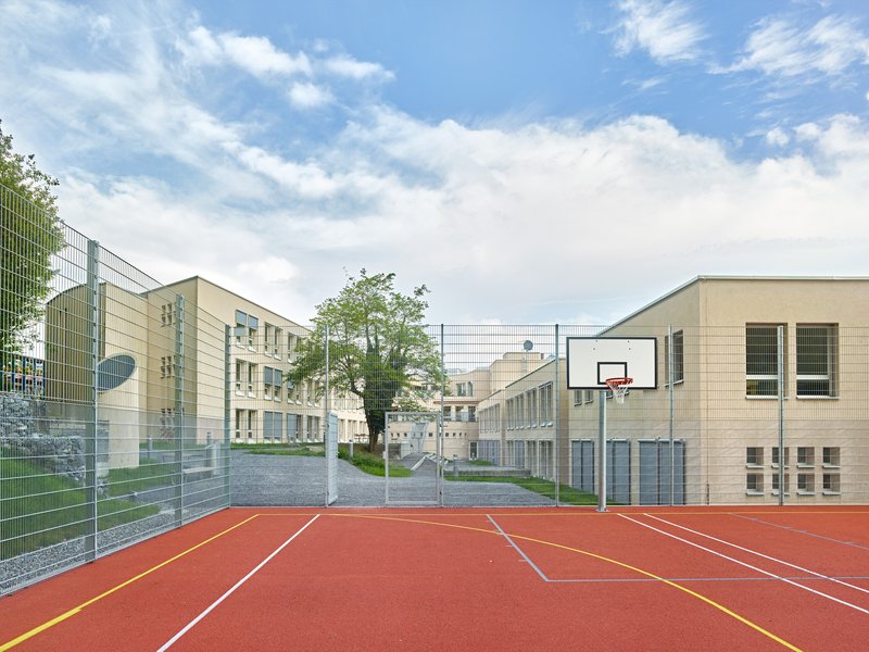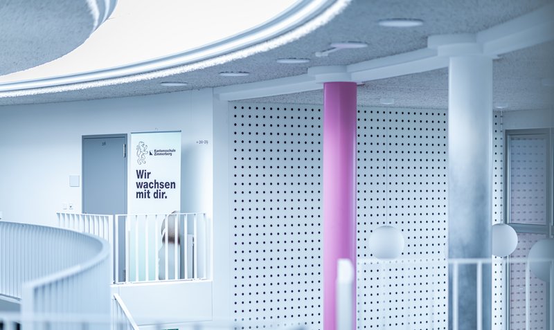 Das im Jahr 1989 errichtete Gebäude orientiert sich architektonisch an der Postmoderne. Es ist lichtdurchflutet und modern und bietet den Schulangehörigen beste Lern- und Lehrbedingungen. Die Schulzimmer und die Infrastruktur sind auf dem neusten Stand und viele architektonische Sonderheiten des Gebäudes wirken auf unterschiedlichen Ebenen inspirierend. Durch das Farb- und Signaletikkonzept wurden die räumlichen Qualitäten gekonnt betont. Die verschiedenen Muster- und Farbkompositionen, verteilt über das ganze Schulhaus an ausgewählten Wänden und Säulen, erzeugen eine Vielfalt an Eindrücken und Emotionen.